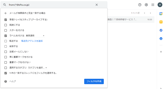 フィルタは一時的な検索にあたりますが、例えば、とある人からのメールは「○○プロジェクトに関する話だから対応が必要」、とある件名のメールは「自動送信メールなので、さほど重要ではない」など、分類をするための機能として、ラベルを作成することができます。フィルタの規則に一致したメールにラベルを一括で付与し、ラベル検索で閲覧することができます。まず上記の画像から、[フィルタを作成]を選択して設定していきます。