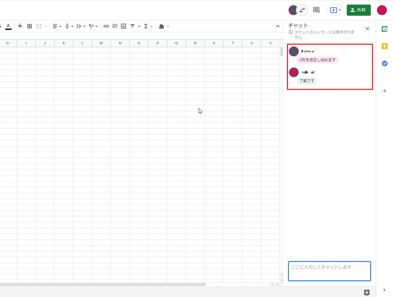 共有したファイルへ複数人からアクセスがあるとき、以下のように右上のアイコンからチャットを開始することができます。