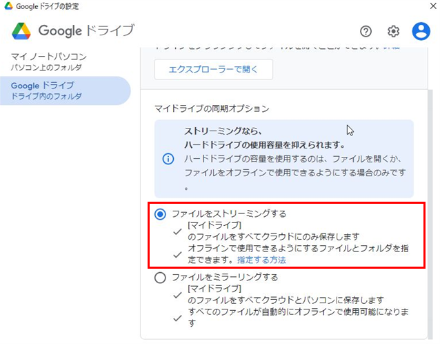 「パソコン版Google ドライブ」では、Web上のドライブとの同期方法を「ストリーミング」と「ミラーリング」の2種類から選択できます。